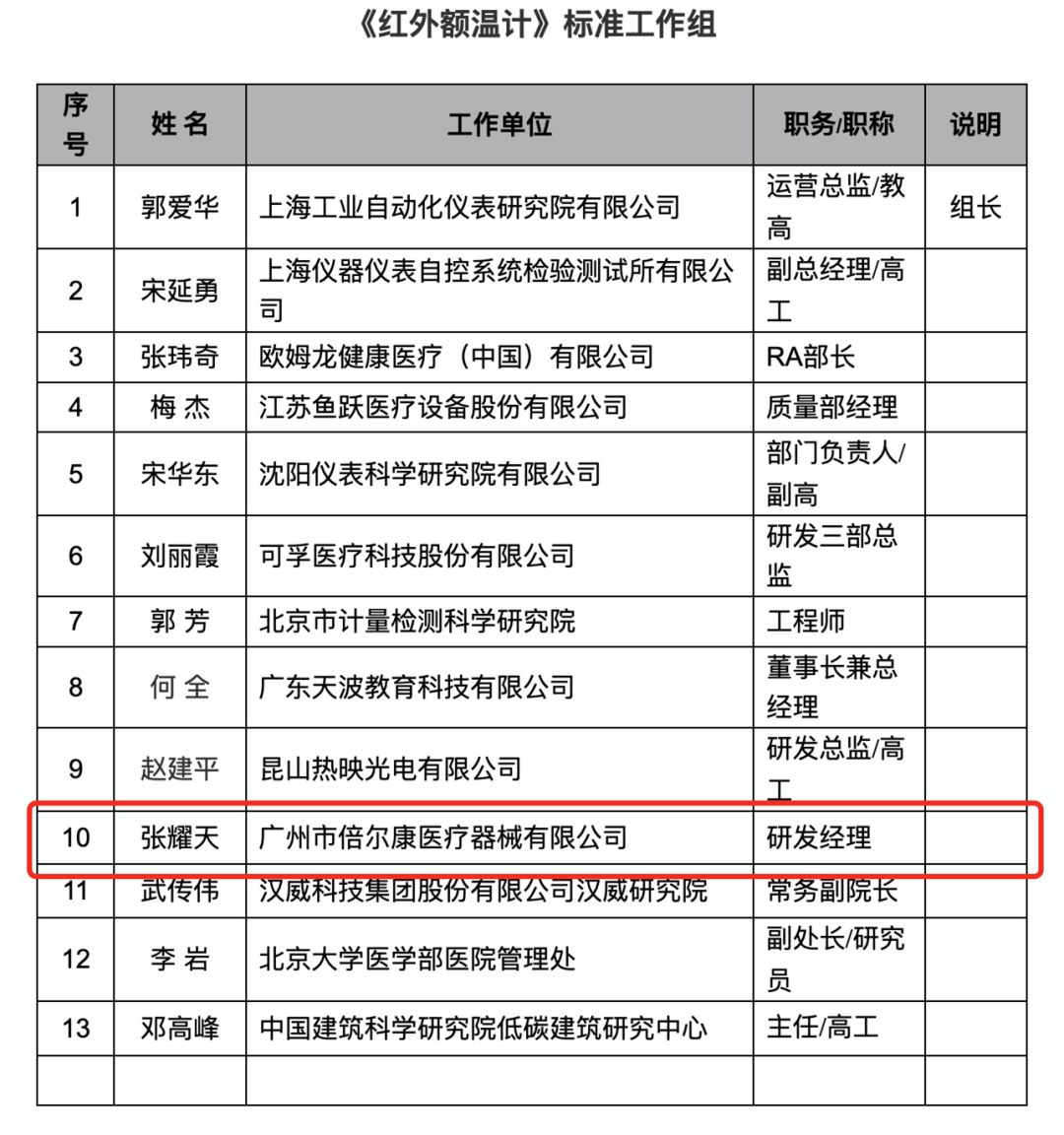 早在今年的4月份,中國儀器儀表學會為滿足市場的需要,規范產品的技術要求、測量準確度、可靠性等質量要求,規范一致的試驗方法,用標準促進紅外額溫計產品在整體質量和性能上的全面提升等成立了紅外額溫計標準制定工作組,倍爾康的研發經理張耀天作為行業代表參與了這項工作。