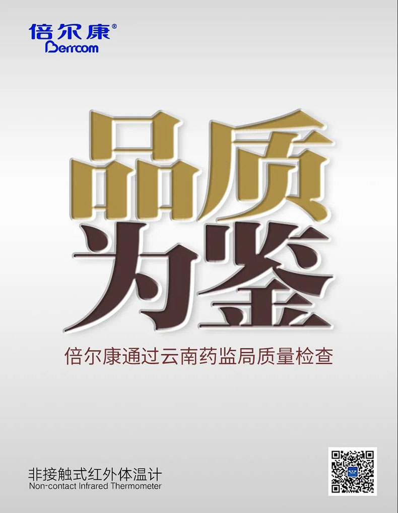 日前,云南省藥品監督管理局發布2020年第一期醫療器械質量公告,倍爾康的非接觸式紅外體溫計JXB-178被抽樣檢查,并順利通過質量監督!